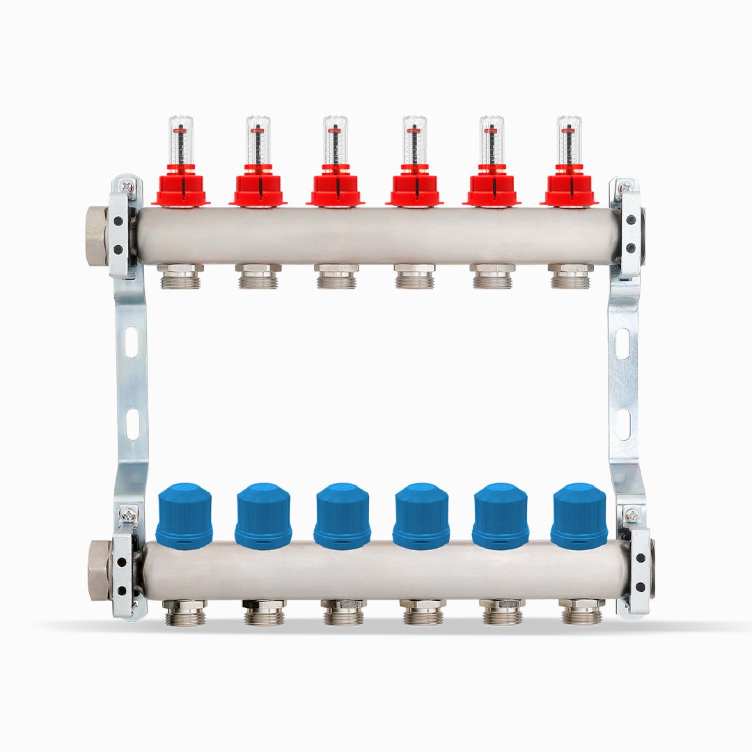Consisting of: – 1 flow manifold in stainless steel AISI 304L with flow meters – 1 return manifold in stainless steel AISI 304L with Thermostatic Shutter preset for electrothermal actuators – 2 complete metal brackets
